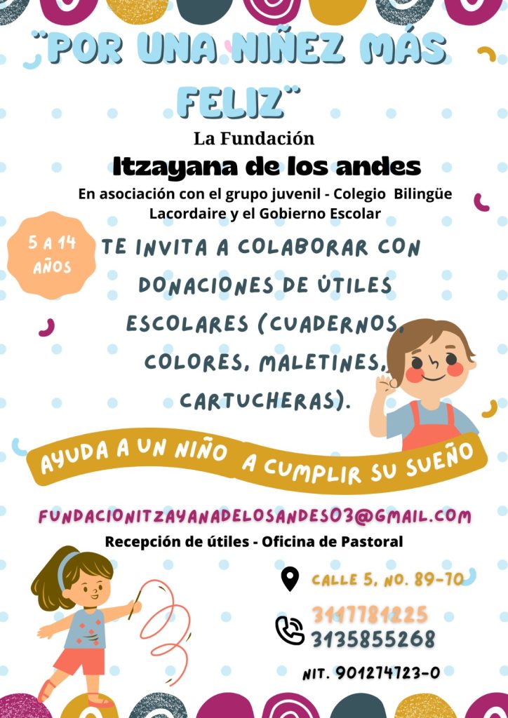 La Fundación Itzayana de los Andes en asociación con el grupo juvenil Colegio Bilingüe Lacordaire y el Gobierno Escolar: Te invita a colaborar con la donación de útiles escolares (cuadernos, colores, maletines, cartucheras) Ayuda a un niño a cumplir sus sueños Info: fundacionitzayanadelosandes03@gmail.com 3117781225 3135855268